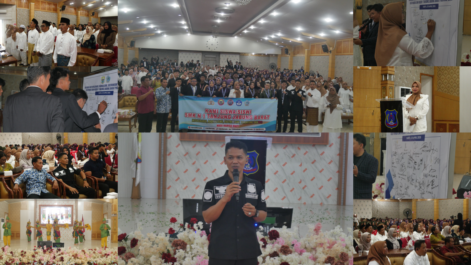 Acara dibuka dengan khidmat melalui penampilan Tari Sekapur Sirih yang dibawakan dengan anggun oleh siswa-siswi SMK Negeri 1 Tanjung Jabung Barat sebagai bentuk sambutan kehormatan. Dalam sambutannya, Kepala SMK Negeri 1 Tanjung Jabung Barat, Ibu Heni Septi Nuraini, S.Pd., M.Pd.I., menyampaikan pentingnya sinergi antara lembaga pendidikan dan aparat penegak hukum dalam menjaga lingkungan sekolah agar tetap kondusif dan bersih dari pengaruh radikalisme.